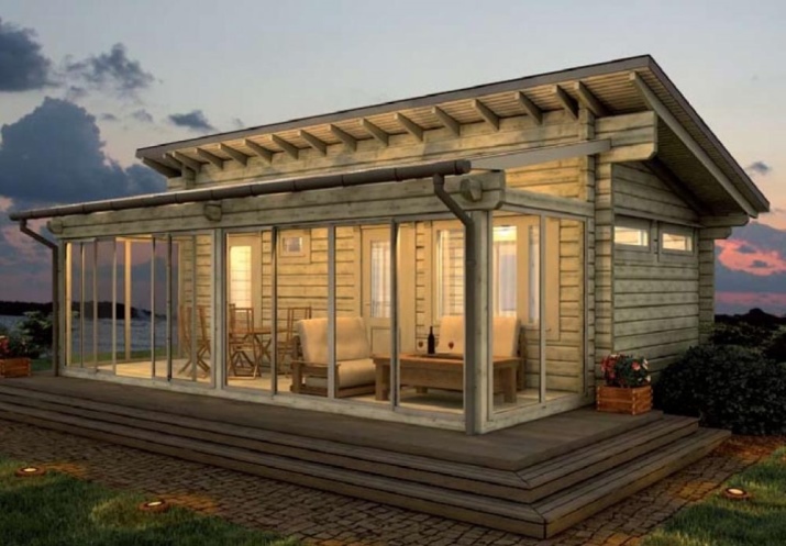 - Een eenvoudige moderne variant van een klein badhuis en bijgebouw met volledige beglazing. De veranda is beschut tegen wind en regen. Tegelijkertijd bieden panoramische ramen een uitzicht over het omringende landschap.