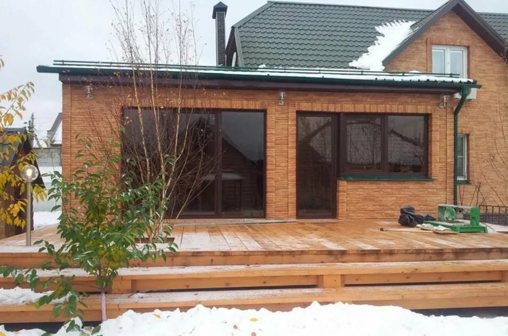 Bij de keuze van een bouwmateriaal voor een aanbouw hoeft u niet te kijken naar de identiteit met het huis. In deze kwestie kunt u zich laten leiden door budgettaire mogelijkheden, bruikbaarheid, esthetische component. Steen, baksteen, hout - al deze materialen gaan goed samen. Zo kan bijvoorbeeld een houten veranda met een leien dak met enkele dakhelling aan een blokbad worden vastgemaakt. In sommige spectaculaire ontwerpen wordt een glazen dak aangebracht om zoveel mogelijk licht in de kamer binnen te laten.