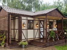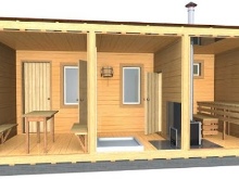 Door een veranda aan het saunahuis te bevestigen, worden verschillende problemen tegelijk opgelost. Ten eerste biedt het een plaats waar u gemakkelijk uw schoenen kunt uittrekken of zelfs bovenkleding kunt achterlaten. Ten tweede, de vrije ruimte kan gebruikt worden om een open haard te maken. Ten derde kan hier in de zomer een buitenzitje worden georganiseerd - in de veranda is het heel goed mogelijk om een kleine bank, een ronde tafel en een paar klapstoelen te plaatsen. De hut zelf ziet er zeer aantrekkelijk uit, aangezien hij van hout is gemaakt. De omlijsting van de ramen en de deuropening met hout in een andere kleur maakte het uiterlijk van het bouwwerk homogener.