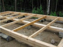 Een houten frame met een dikte van 10 centimeter wordt over de waterdichting geplaatst. De houten basis van de sauna moet onmiddellijk met conserveringsmiddel worden behandeld. Het is een goed idee om steunblokken te gebruiken om een helling van 1% te creëren naar de kant waar de sauna komt te staan. Dit zal zorgen voor een betere drainage. De hut wordt met behulp van een kraan op de afgewerkte basis geplaatst.