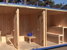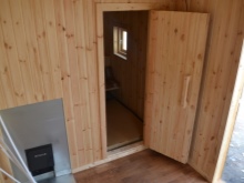 In de saunacabine moeten alle deuren opengaan in de richting van de hoofduitgang. Een ruimte van 2,2 x 2,5 meter is geschikt voor de sauna; de vuurkamer bevindt zich in de ontspanningsruimte. Als verwarmingselement kan een ombouwbare saunakachel, een boiler of een goedkoop ontwerp met een kachel geschikt zijn.