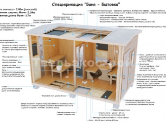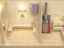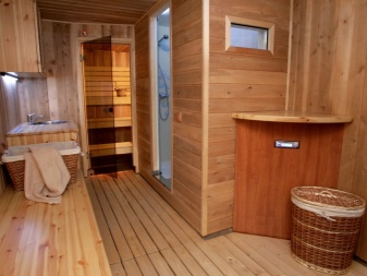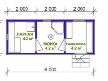 Aangezien een standaardcabine 2,3 meter breed is, is bij de indeling van de sauna rekening gehouden met loopbruggen. Niettemin Het is mogelijk om een vestibule, kleedkamer, toilet en sauna onder één dak te plaatsen. Om ruimte te besparen kan de wasruimte het best worden weggelaten, maar een douchecabine kan achter een scheidingswand in de zitkamer worden geplaatst.