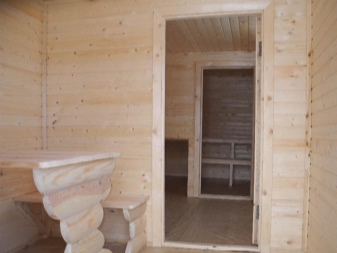 Bij hutten met terras kan de ontspanningsruimte in principe vervallen, maar de vrijgekomen ruimte kan beter als toilet worden gebruikt. Hetzelfde kan worden gezegd van de vestibule - als de opslagruimte voor brandhout buiten is ingericht, is er geen grote vraag naar deze ruimte.