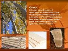 - Higieniczne. Aspen zawiera substancje bakteriobójcze i fitoncydy, które pomagają w oczyszczaniu powietrza i narządów oddechowych.