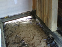 W przypadku intensywnego użytkowania niektóre elementy podłogi w saunie wymagają z czasem wymiany. W takim przypadku należy usunąć wszelkie deski lub belki podłogowe, które zgniły, a następnie usunąć gruz nagromadzony pod konstrukcją podłogi. Środki te zapobiegną przedostawaniu się mikroflory grzybów ze starej podłogi do nowych desek. Zaleca się dodatkowo naciąć ziemię na głębokość 10-15 cm. Na podłoże należy zastosować środek antyseptyczny, przy czym bardzo skuteczny jest siarczan miedzi.