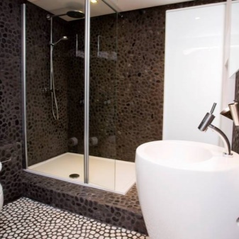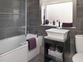 Pomimo niewielkich rozmiarów łazienki, ciemne płytki mogą być stosowane jako uzupełnienie jasnych, jeśli zostaną dobrane odpowiednie odcienie. Na przykład, stonowany kolor granatowy lub marsala doda wnętrzu głębi, nie wpływając negatywnie na geometrię pomieszczenia. Należy pamiętać, że na ciemnych płytkach będzie widoczny kamień, dlatego należy o nie dbać bardziej starannie.