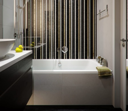 Do bardzo małych łazienek należy wybrać płytki ceramiczne w tym samym kolorze, ale w różnych odcieniach. W przypadku mniejszych ścian stosuje się jaśniejsze materiały, a w przypadku większych - ciemniejsze. W ten sposób można wizualnie zmienić geometrię pomieszczenia. Zaleca się również stosowanie poziomych linii w ciemnych kolorach, aby przestrzeń wydawała się wyższa, natomiast linie pionowe są zalecane, aby sufity wydawały się wyższe.