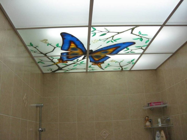 Aby urozmaicić nawet najbardziej skromne i powściągliwe wnętrze łazienki, pomoże oryginalne rozwiązanie pokrycia sufitu. Na przykład ogromny, jasny motyl na tle gałęzi drzew z pierwszymi wiosennymi liśćmi i śnieżnobiałymi pąkami. Odpowiednio rozmieszczone oprawy oświetleniowe sprawiają, że obraz jest jeszcze bardziej dramatyczny i naturalistyczny.