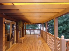 - Um dossel para um grande alpendre com espreguiçadeiras e uma área de jantar. O telhado é frequentemente feito de policarbonato, montado sobre uma armação.