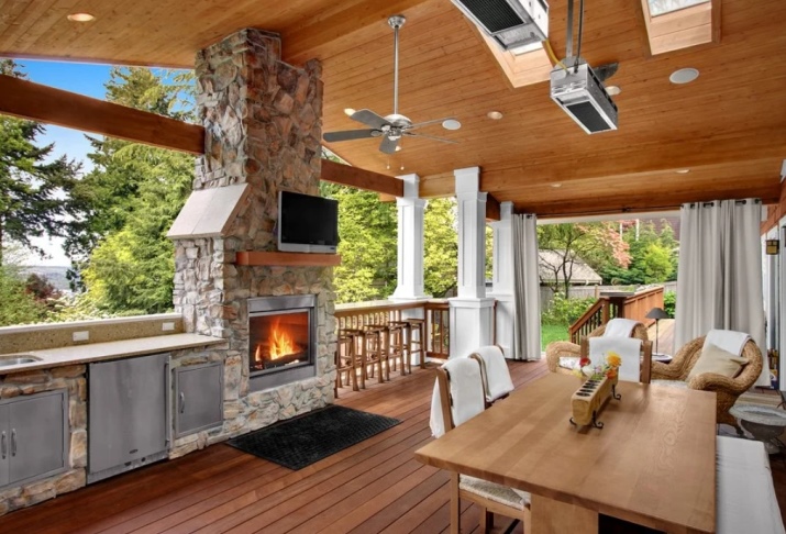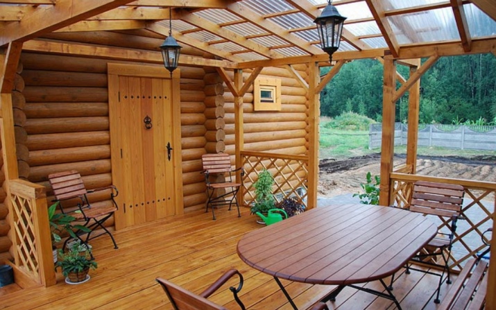 A concepção das extensões depende da finalidade do espaço resultante. Na maioria das vezes, uma sauna já tem um conjunto completo de necessidades básicas, e a expansão vai a favor da zona de conforto, as chamadas zonas de relaxamento, onde se pode tomar uma chávena de chá com os amigos e até cozinhar uma espetada. É confortável relaxar em qualquer edifício - na varanda, terraço, pérgula ou simplesmente debaixo de um dossel - o principal é criar um ambiente confortável. Pode usar os exemplos já prontos para ver como os lugares sentados estão dispostos em áreas fechadas.