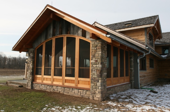 A madeira é um material natural que se integra perfeitamente no paisagismo do campo. É adequado para extensões de Inverno e Verão. Estas paredes têm baixa condutividade térmica e são esteticamente agradáveis. A madeira é fácil de trabalhar, mas necessita de uma cobertura protectora.
