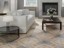 O grés porcelânico cria um ambiente harmonioso. A gama inclui elementos de decoração, que contêm decorações florais com motivos geométricos.