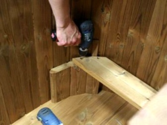 - Scaunele sunt așezate pe bază, piesele de capăt adiacente sunt îmbinate și înșurubate. Capetele trebuie să fie înfipte în lemn. Apoi, golurile sunt sigilate cu un material special de umplere a lemnului rezistent la apă.