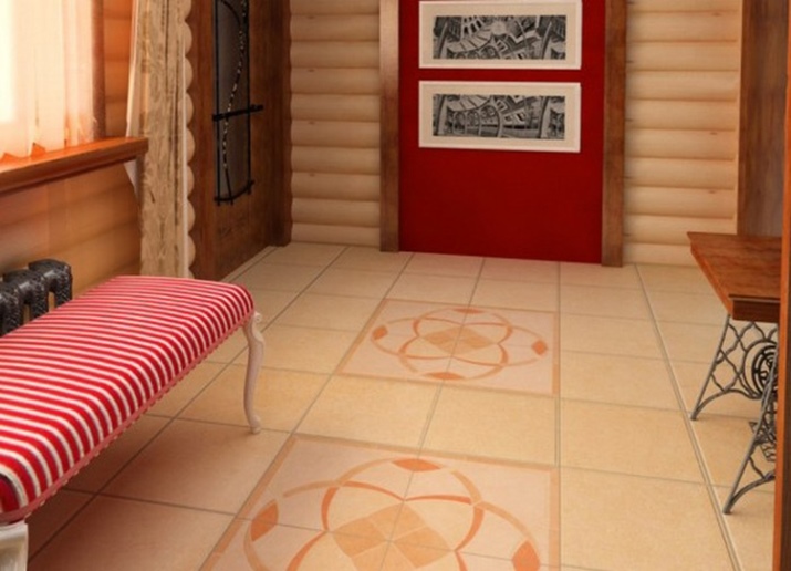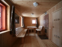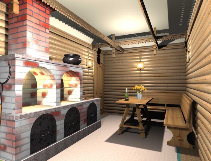 - Amenajarea anticameră pentru a semăna cu interiorul unei colibe rusești, folosind obiecte adecvate și elemente sculptate în tavan.