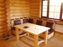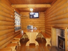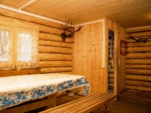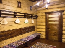 - Opțiune pentru o antecameră de saună din bușteni, folosind elemente ale stilului rusesc. Prezența textilelor și a ustensilelor din lemn.