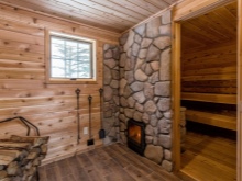 Uneori, podeaua este căptușită cu piatră, deși, în practică, este un material de placare rece. Cu toate acestea, scoate în evidență percepția negativă a lemnului atunci când acesta este abundent în placări. Piatra se combină bine cu diferite tipuri de lemn. Este rezonabil să o folosim pentru placarea peretelui de lângă sala de saună. Atunci când este încălzită, piatra acumulează căldură în anticameră, oferind un microclimat confortabil în interiorul saunei.