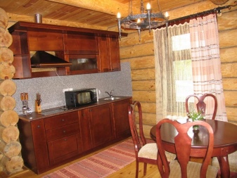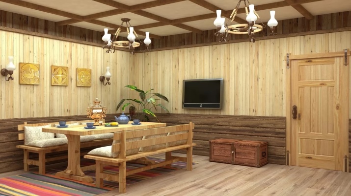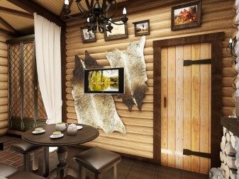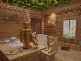 Accesorii precum pictura Khokhloma și samovarul vor fi utile. Scaunele și mesele în formă de buturugă dintr-o saună din bușteni pot fi un bun decor pentru anticameră.