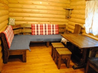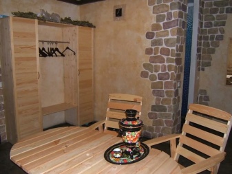 În antecameră, în funcție de aspectul saunei, puteți instala o chiuvetă, câteva rafturi, o masă cu un bar pentru micul dejun și scaune de bar din lemn. Alegerea mobilierului depinde de dimensiunea camerei. De exemplu, mobilierul pentru o cameră mică ar trebui să fie standard. Pentru o cameră mică, ar trebui achiziționate unități compacte.