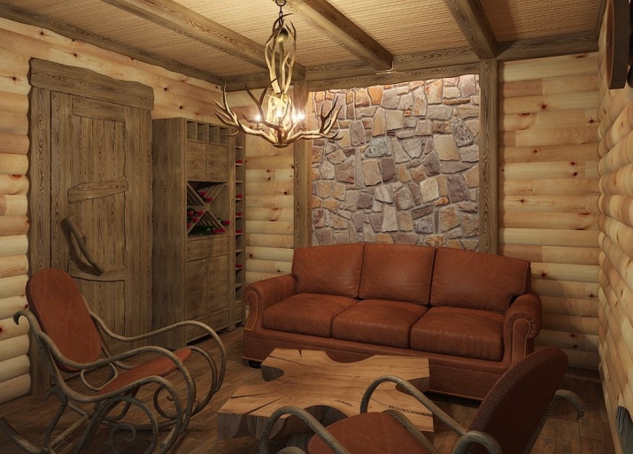 - Exemplu de design pentru o zonă de relaxare într-o pre-băi cu pereți din bușteni. Un joc al contrastelor de culoare între pereți, mobilier și textile.
