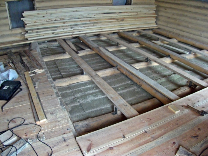 - Se creează un substrat din bucăți de lemn și se lasă spații libere pentru a împiedica deformarea podelei din cauza efectelor temperaturii. Resturile sunt așezate pe grinzi.