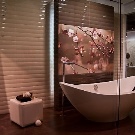 Prostredie kúpeľne by malo podporovať relaxáciu a pokoj. K tomu prispieva interiér navrhnutý v teplých, tlmených tónoch. Krémovo-hnedá kombinácia obkladov dokonale ladí s dekoratívnym pozlátením. Obraz dopĺňa veľké zrkadlo, komoda a lampy v rovnakom štýle.