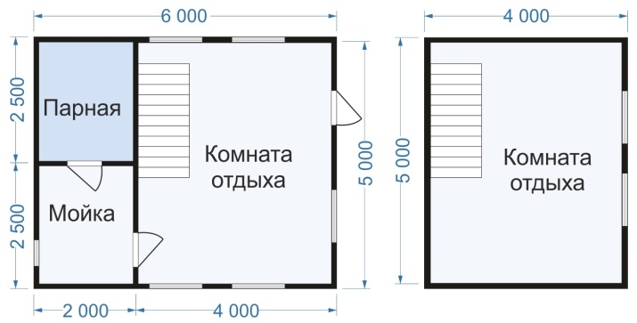 V nekaterih primerih boste morda morali zgraditi savno velikosti 6x3 m. V dvonadstropnih stavbah lahko sprejme do 5 oseb. Glavni poudarek je na preddverju in parni kopeli. Prostori za prhanje in zabavo so le redko, če sploh, namenjeni enonadstropnim različicam. Zasnova mora biti takšna, da se police ne približujejo ogrevalnim napravam; postavljene so ob prazni steni.