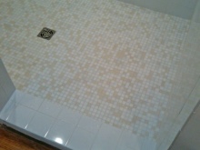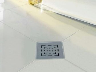 - polaganje ploščic z lepilom za ploščice in gladilko v smeri od odtoka proti stenam z obrezovanjem v skladu z načrtovano postavitvijo in obliko okrasnega prekrivanja na odtočni odprtini;