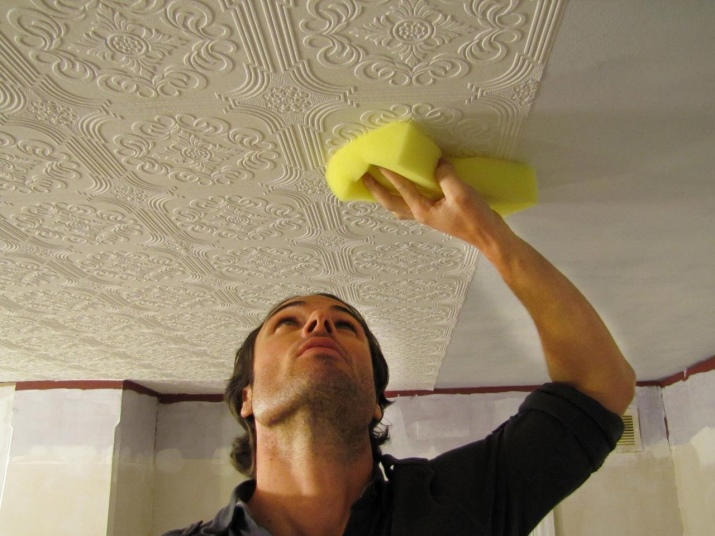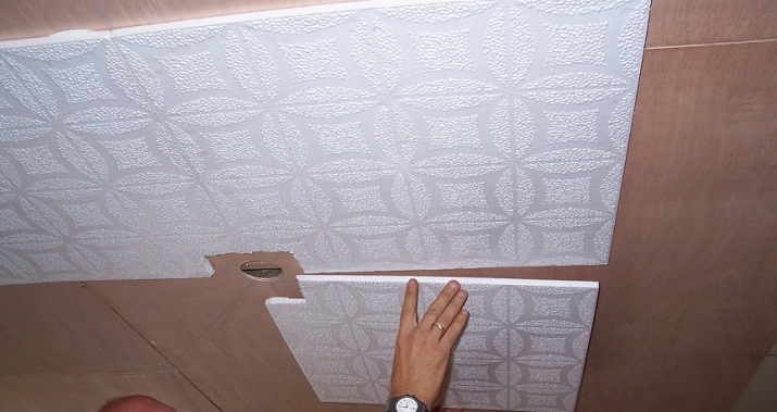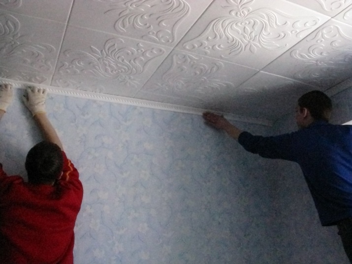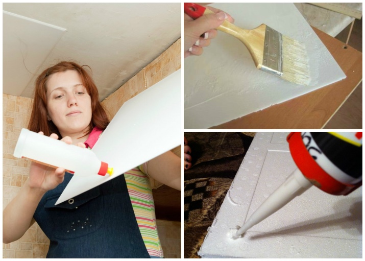 Lepilo enakomerno nanesite vzdolž diagonalnih linij ploščice in njenega oboda. Nato ga nežno nanesite na strop in rahlo pritisnite. Vsaka naslednja plošča je v liniji s prejšnjo brez zamikanja. Lepilo, ki se je izločilo, je treba takoj odstraniti s suho krpo, da ne pusti sledi na polistirenski peni.