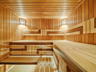 Ett bra exempel på användning av abachaträ i inredningen av en bastu. Hyllor och väggar som är ventilerade ser harmoniska och attraktiva ut.