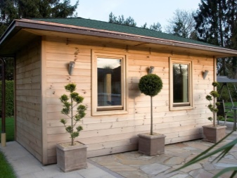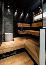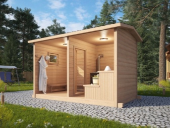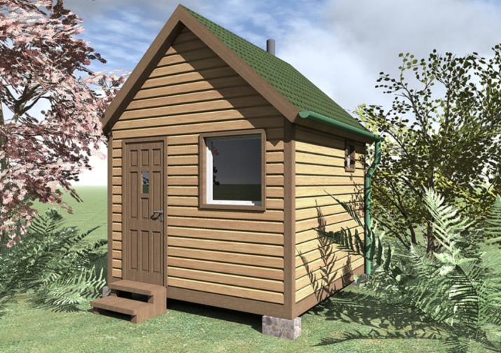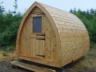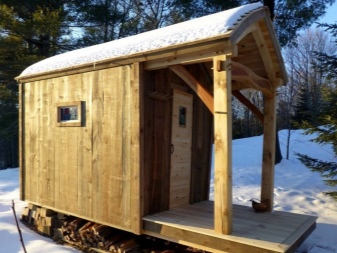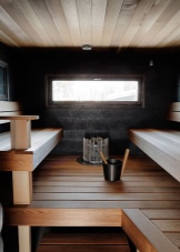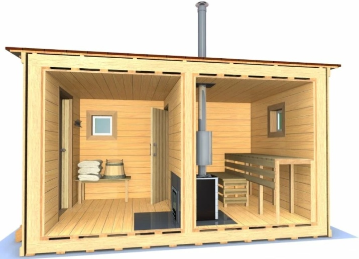 Bilden nedan visar ett möjligt arrangemang av en miniatyrbastu. En enkel "stuga" i trä med ett svart tak ser relativt bra ut. På insidan finns det minsta möjliga utrymme och tillbehör för hygieniska förfaranden.