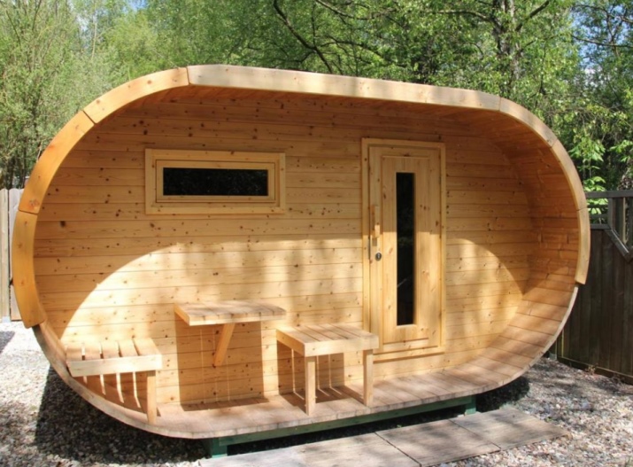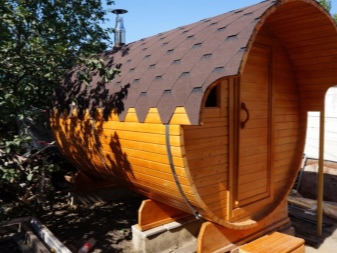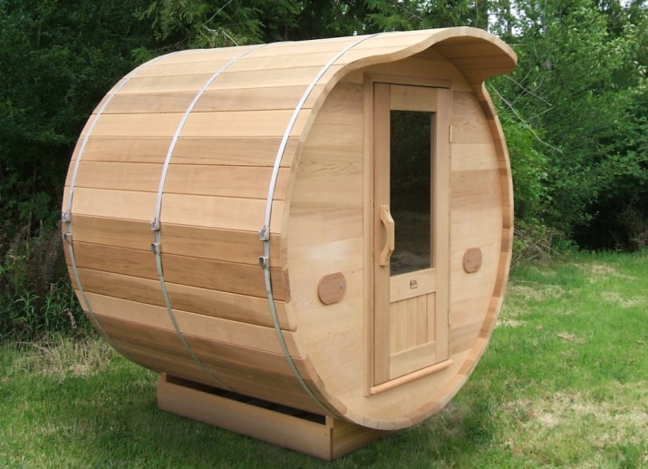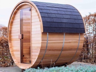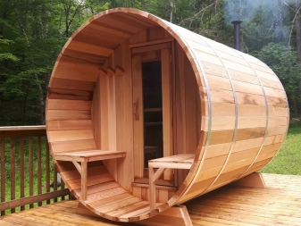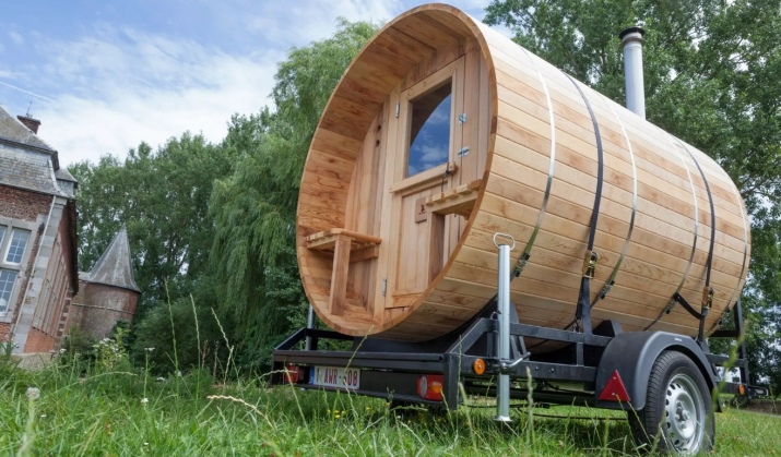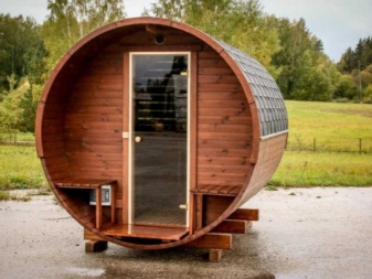 Vi talar om en ganska allmänt känd variant, "fatbastun". Den skiljer sig inte mycket i funktionalitet från vanliga stationära byggnader. Utvändigt liknar den en stor tunna. Vanligtvis finns det en vägg på insidan som delar strukturen i två huvuddelar. Ett block är avsett för ång- och duschprocedurer, och det andra blocket används för installation av värmeanordningar, ombyte och kortare vila.