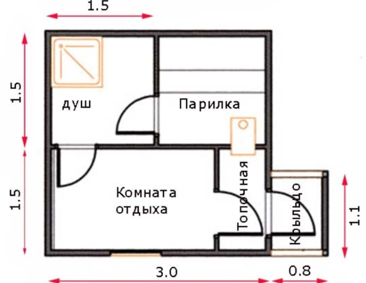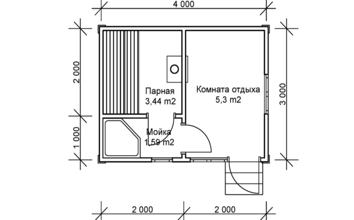 Det finns många ritningsalternativ att följa. En av dem består av en 3x4 meter stor byggnad som är uppdelad i två lika stora delar med en vägg. Basturummet och diskbänken är tillsammans 5,03 m². Relaxrummet är däremot något större - 5,32 kvadratmeter.