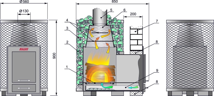 Vissa källor föreslår att man använder isolerande material i stället för ett galler. Även om detta minskar strålningen kommer den mesta värmen att försvinna genom skorstenen och rummet kommer därför inte att värmas upp ordentligt. Det ökar också förbränningshastigheten och kräver mer bränsle. Därför är det bättre att använda ett galler eller en korg - formen på stenhållaren kan variera.