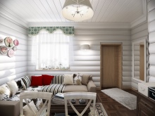 I den moderna versionen av ett timmerhus finns det inga begränsningar när det gäller valet av färgsättning. De ljusaste färgerna och tonerna finns tillgängliga. Det är dock viktigt att inse att detta omedelbart förstör den ursprungliga atmosfären, den unika andan i en sådan miljö, för vilken de är värderade. Det är onödigt att bygga ut de övre våningarna.