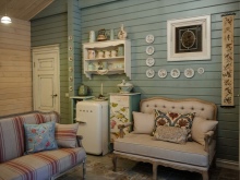 - Häng upp enfärgade gardiner av linne eller chintz (den dominerande strukturen är blommig eller små rutor).