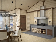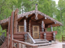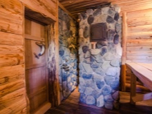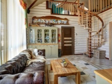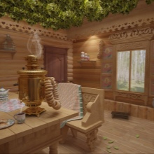 Älskare av den ryska traditionella stilen kan ta det här exemplet som exempel. Användningen av obearbetade stockar och andra framhävda naturmaterial ger ett positivt intryck.