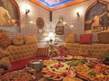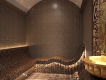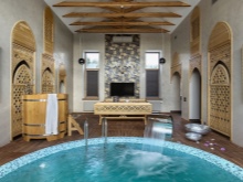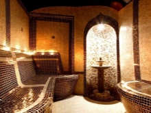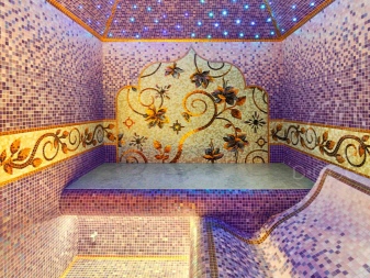 Den här lösningen är naturligtvis dyrare än en traditionell träfinish. Men det övergripande utseendet är mycket chicare. Lokala inslag av orientalisk stil (på ett mindre radikalt sätt) är den rika mosaiken och de exotiska ornamenten på kakelplattorna i duschutrymmet och i poolen. Vissa människor har inrättat hela vattenpipsrum med ljusa gardiner, små bord och färgglada kuddar. Det är en lösning som är vacker, billig och originell på samma gång.