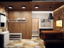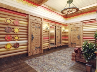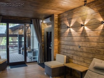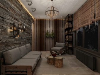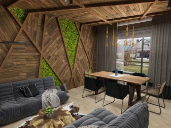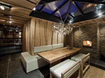 En del fans av ovanlig design är entusiastiska över "skogsmästarstilen" - och det med goda skäl. Väggarna och taket är vanligtvis täckta med kalkplankor. Hyllorna är tillverkade av timrad lind. Andra träslag är inte lämpliga för detta element! När du planerar en viss inredning bör du se till att den är visuellt komplett.