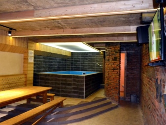 Loftinteriörerna för badhuset och hemmet har vissa gemensamma drag. Den här stilen är ett val för starka, självsäkra och avancerade personer. Den väljs främst av dem som inte är rädda för radikala experiment. Det är vanligt att kombinera en tegelvägg (som om den vore "oavslutad") med en accentuerad rå trävägg. Man kan också använda ett strängt, lättskött spis med mjuka, harmoniska möbler.
