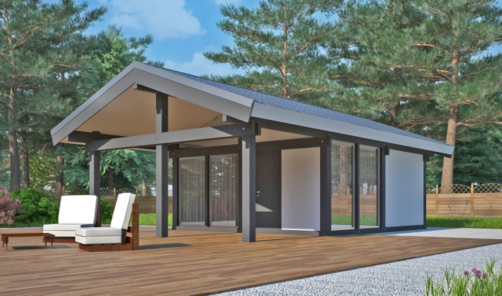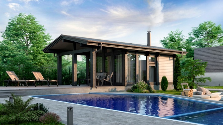 Den här bilden visar ett elegant badhus i fackverk. En modern twist har harmoniskt smält in i dess utseende. Taket, som sticker ut framåt (som en baldakin), ser mycket originellt ut.