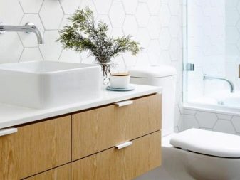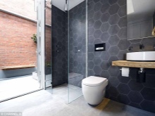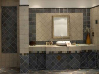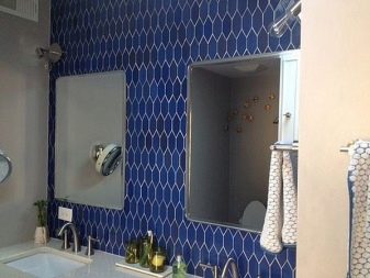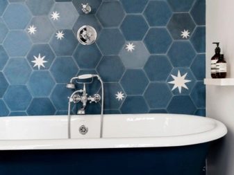 Det finns också plattor i form av komplexa former, vanligtvis polygoner. Sådana plattor är inte lätta att lägga, men om layouten är korrekt utförd kan du få ett extraordinärt mönster och visuellt utjämna bristerna i badrummet, till exempel visuellt utöka rummet eller dölja ojämnheter.