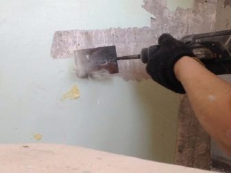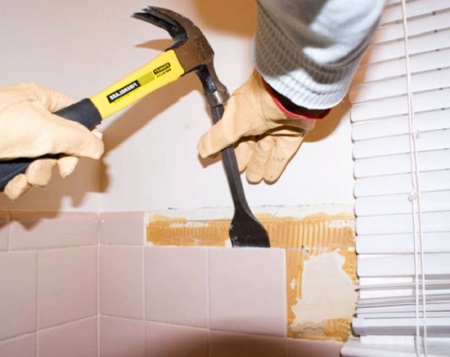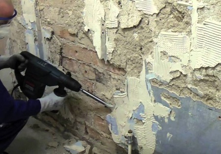 Om ytan är kaklad måste kakelplattorna avlägsnas helt och hållet och limmet avlägsnas från väggen. För att göra detta är det nödvändigt att slipa fogarna väl och fukta ytan rikligt. Efter ett par timmar kan du börja demontera. Ta upp den yttersta plattan med en mejsel, hamra in verktyget i den mjuka massan och ta försiktigt bort plattan.
