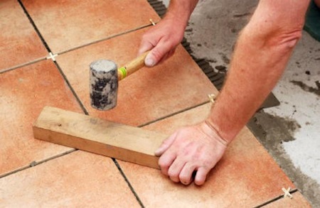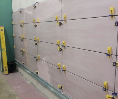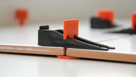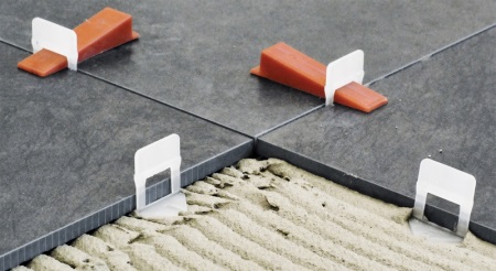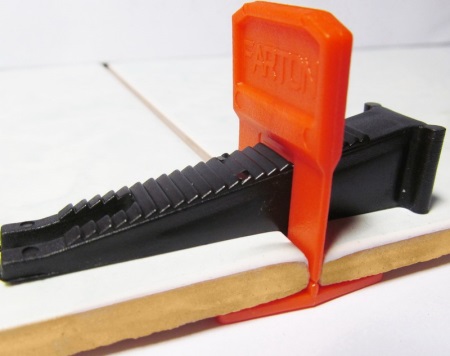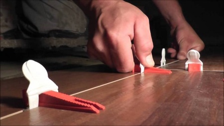 När den första plattan har placerats perfekt installeras en eller två - beroende på det specifika systemet - engångsklämmor på varje sida av plattan, med det avstånd från plattans kant som anges i instruktionerna. I det här skedet planerar konstruktörerna av vissa system för utjämning av plattor att använda plastavståndare för att se till att de angränsande elementen "ansluter" mer exakt och att få perfekta fogavstånd. När alla förberedande steg har slutförts läggs nästa ruta med kakelplattor. Efter att ha försäkrat sig om att de linjer som bildas av kanterna på de angränsande plattorna är raka, utan några felställningar eller "glidningar", sätter hantverkaren in speciella kilar i de klämmor som är placerade mellan plattorna. Syftet med detta är att se till att kilens "sula" är tätt sammanfogad med den yttre ytan på de två angränsande plattorna. När detta har uppnåtts kan man säga att det inte finns några nivåskillnader mellan plattorna.