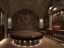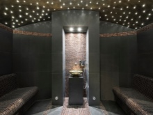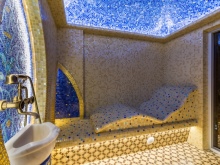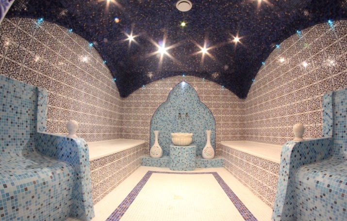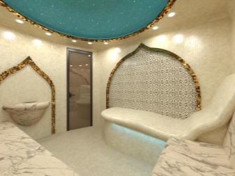 - 用于大型浴室。 如果房间面积允许,你可以把土耳其浴室做成这样的设计,这将创造一种东方童话的感觉。天花板应采用弧形或多层拱顶的形式,并对其进行装饰,使用 "星空 "的技术。石头水碗将完成设计,它们需要用灯光来装饰。银色的水桶将为内饰增添一丝奢华。