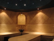 为了突出东方桑拿房的设计和装饰的美感,必须正确选择照明。 由于蒸汽房的温度变化和湿度一直很高,所有的电器配件都必须适合并防止潮湿。 此外,墙体必须配备特殊的电线,有防潮的护套。还应安装一个变压器,以避免在欠压期间发生短路。