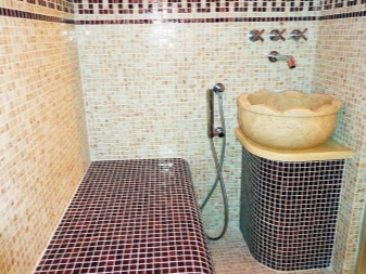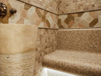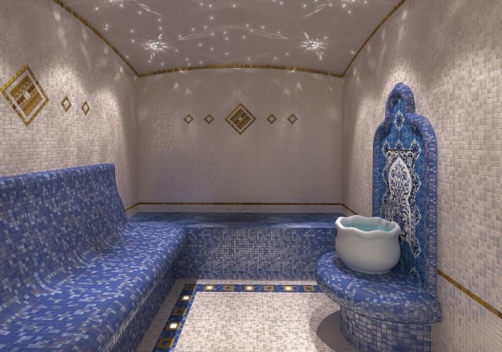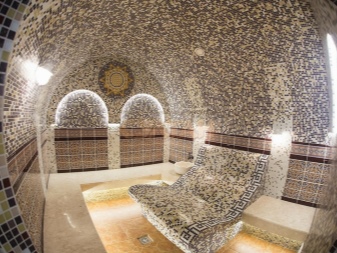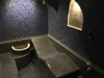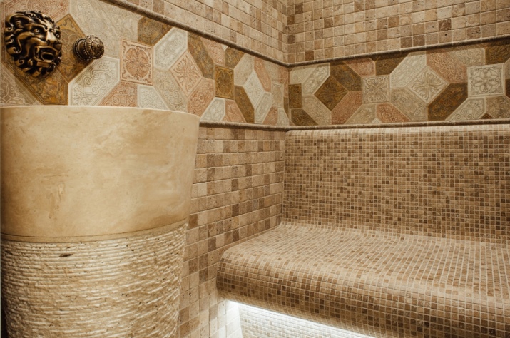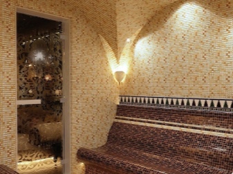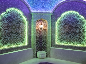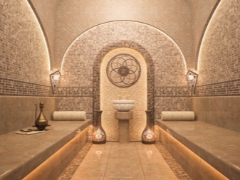 长椅、墙壁、天花板和地板都应该用大理石或瓷砖装饰,并以通常的方式铺设。 在土耳其浴室的马赛克设计看起来很豪华;为了增加设计的独创性,你可以在马赛克的墙壁上放置带有东方图案的作品。