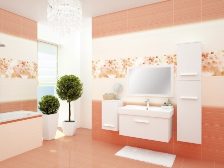 地面和墙面变体的单色瓷砖呈天蓝色,墙面陶瓷的桃红色与应用在陶瓷板上的兰花完美融合。