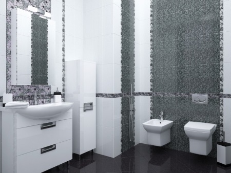 瓷砖有现代色彩:灰色、黑色和白色。品味和奢华的和谐体现在马赛克墙面的陶瓷上,而带有橄榄色花纹的白色装饰则优雅地强调了这个房间的舒适和惬意。