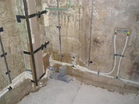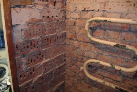 2. 单体建筑。 在这些建筑中,浴室的一面墙是混凝土,其余的墙是由泡沫混凝土或石膏砌块制成。要避免明显的弯曲,所以最好通过抹灰来平整表面,但在工作中需要涂上几层底漆。